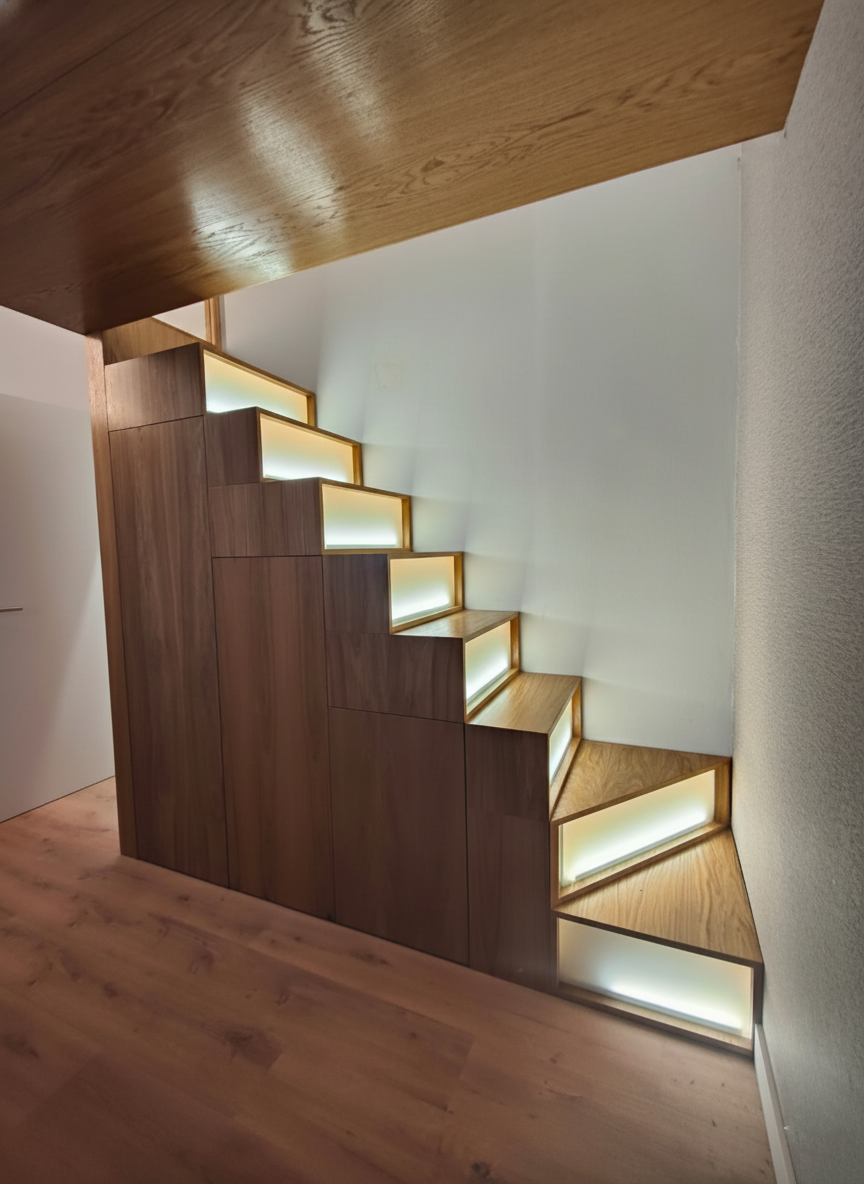 - Mobiliario funcional, sillas, escaleras, puertas interiores.